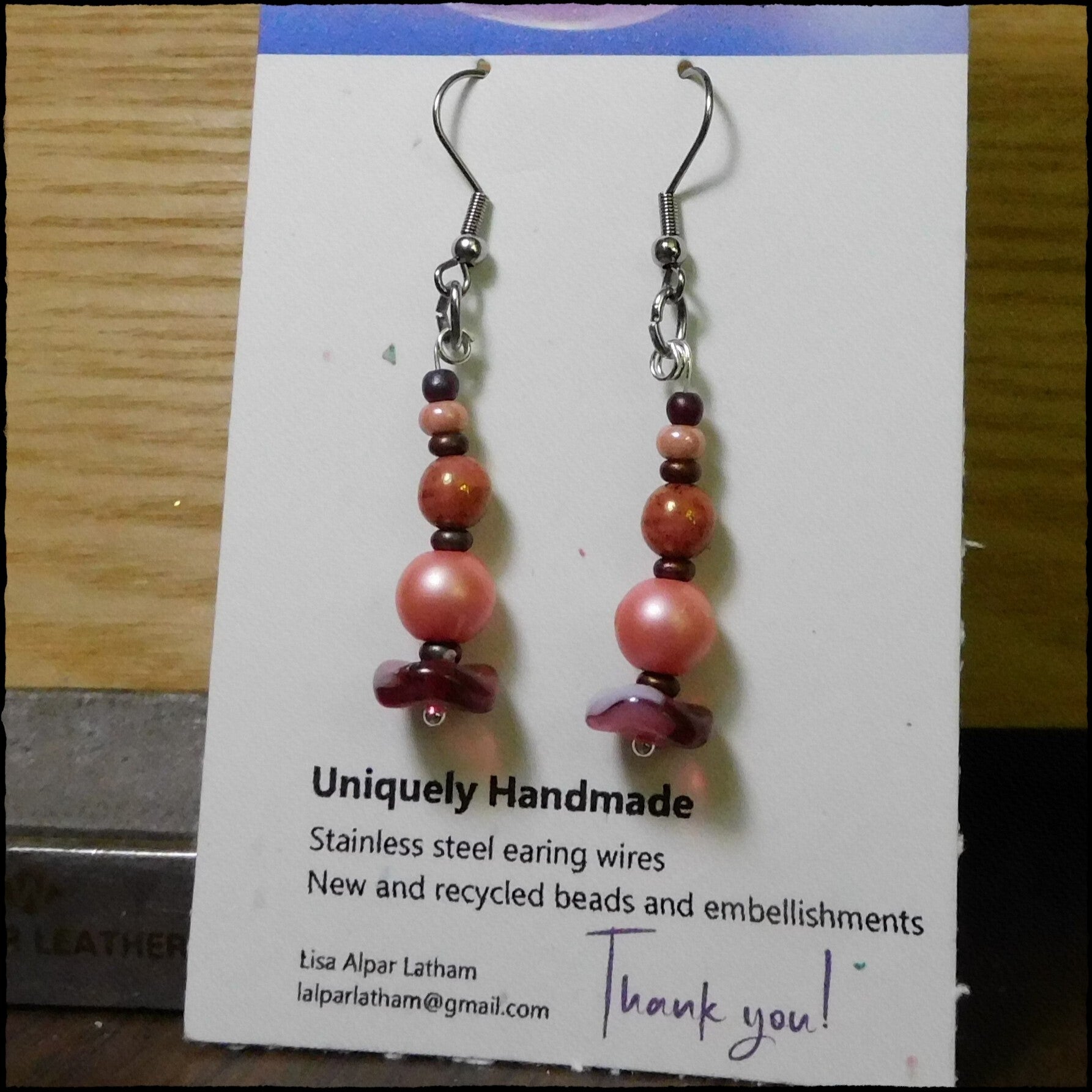 New and recycled beads, embellishments, findings, charms or whatever I could find. Stainless steel earring wires