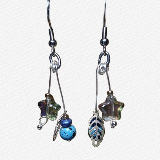 New and recycled beads, embellishments, findings, charms or whatever I could find. Stainless steel earring wires