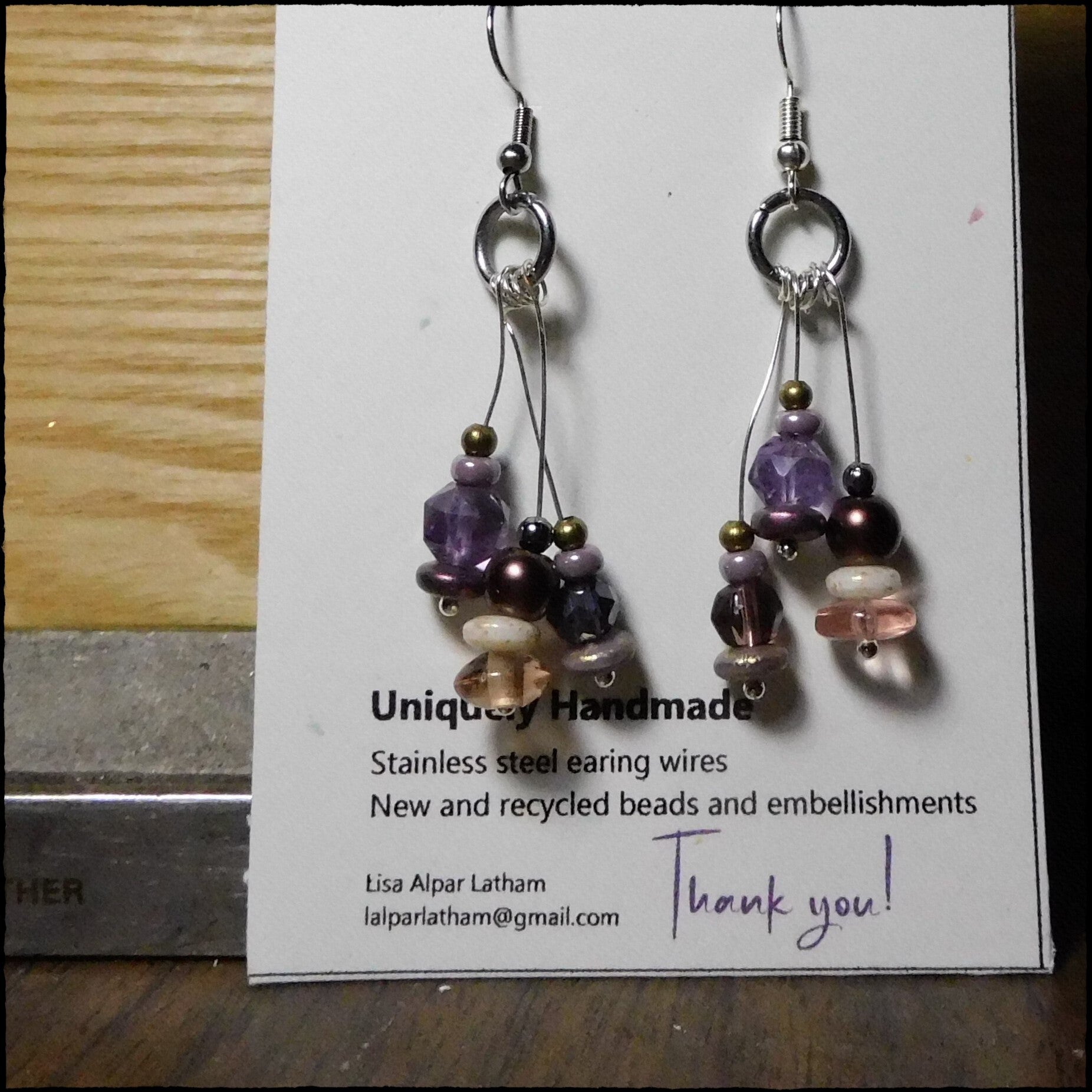 New and recycled beads, embellishments, findings, charms or whatever I could find. Stainless steel earring wires