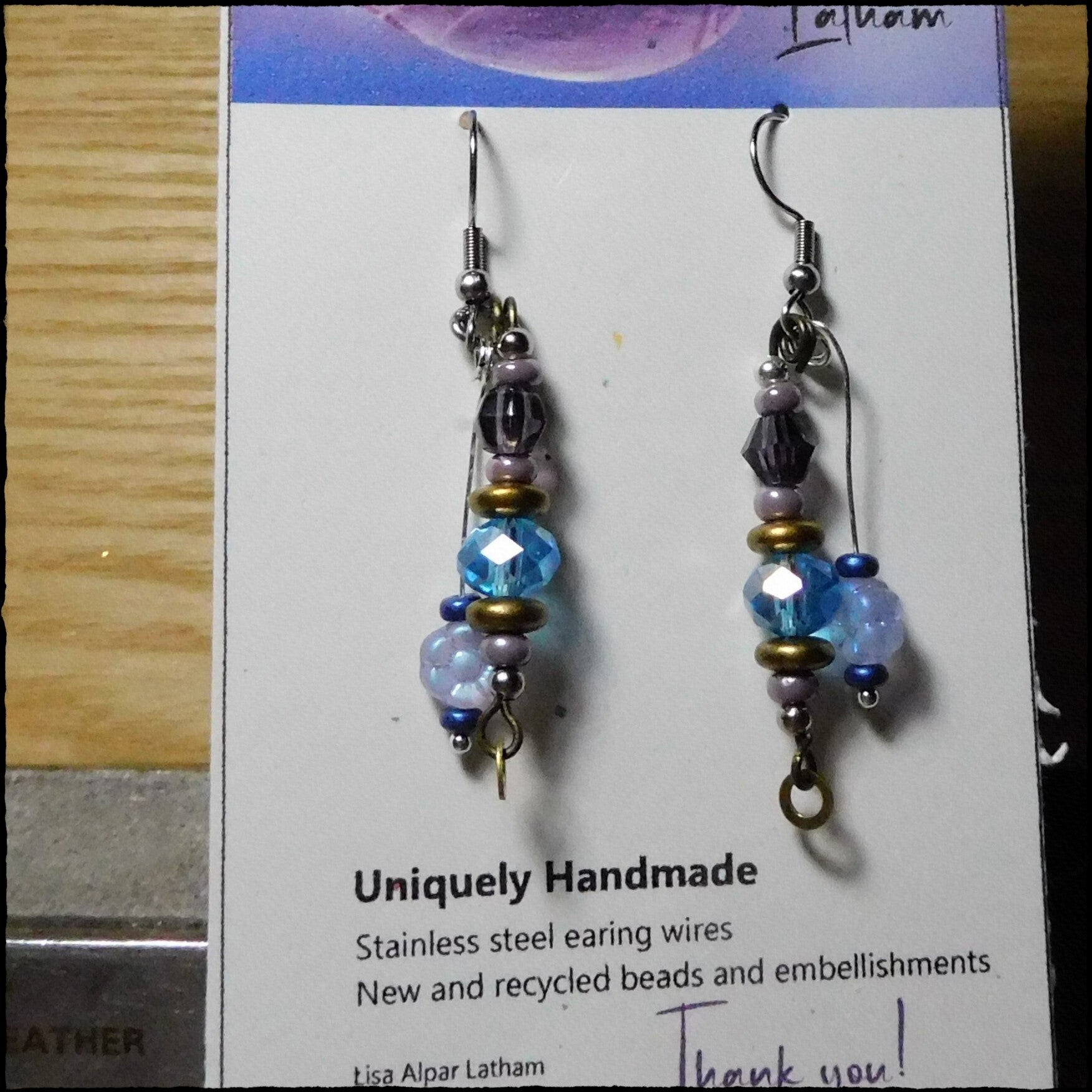 New and recycled beads, embellishments, findings, charms or whatever I could find. Stainless steel earring wires