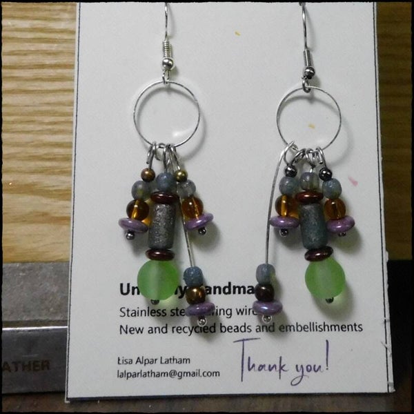 New and recycled beads, embellishments, findings, charms or whatever I could find. Stainless steel earring wires