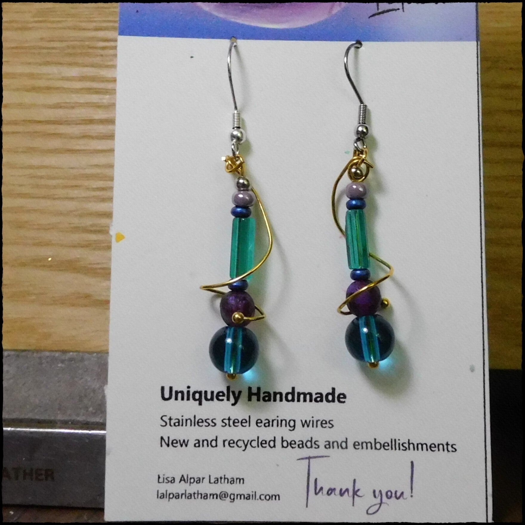 New and recycled beads, embellishments, findings, charms or whatever I could find. Stainless steel earring wires