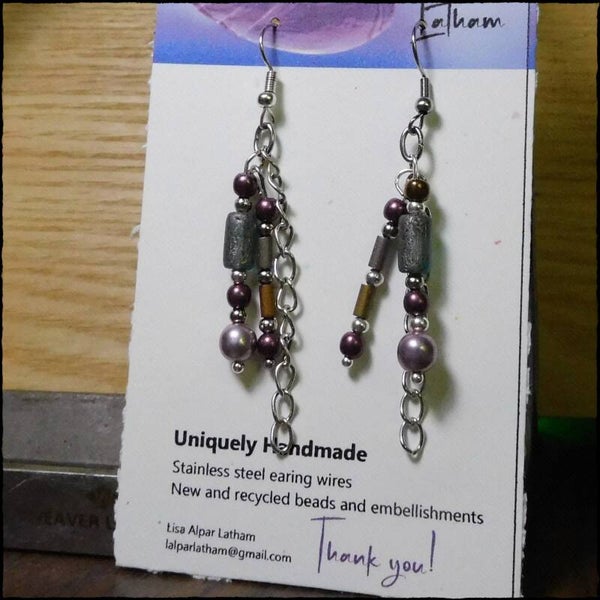 New and recycled beads, embellishments, findings, charms or whatever I could find. Stainless steel earring wires