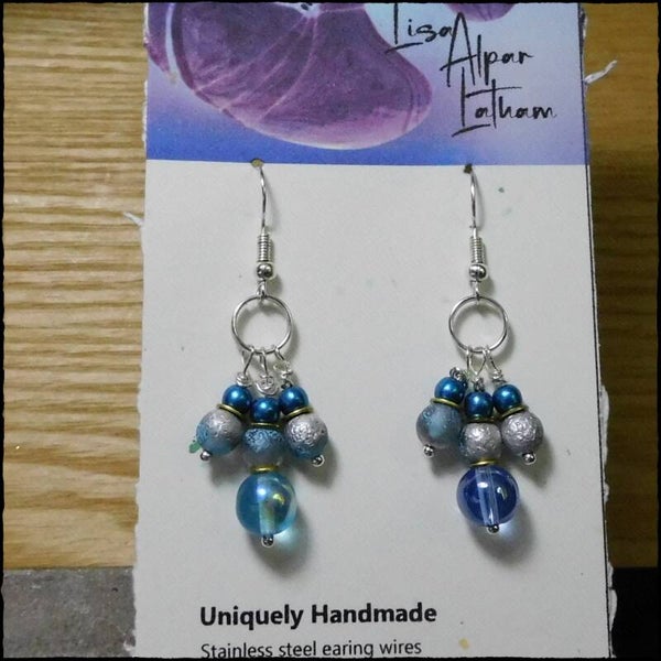New and recycled beads, embellishments, findings, charms or whatever I could find. Stainless steel earring wires