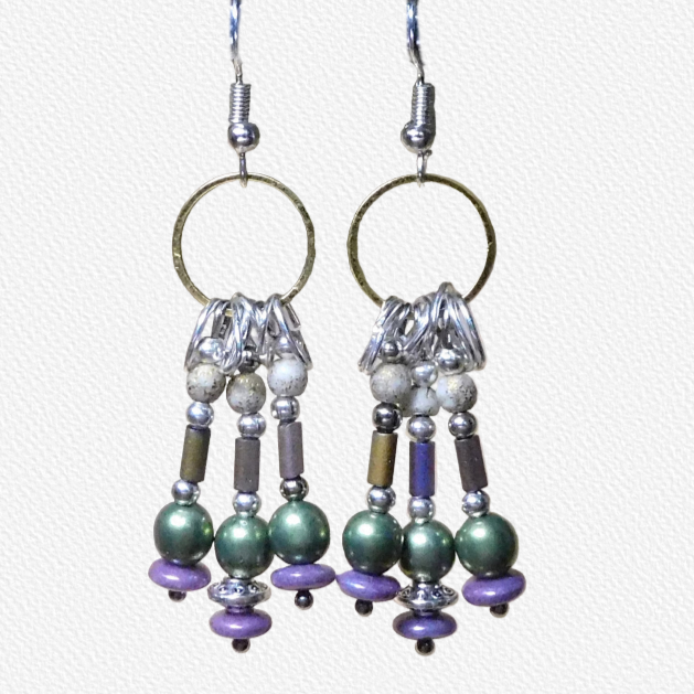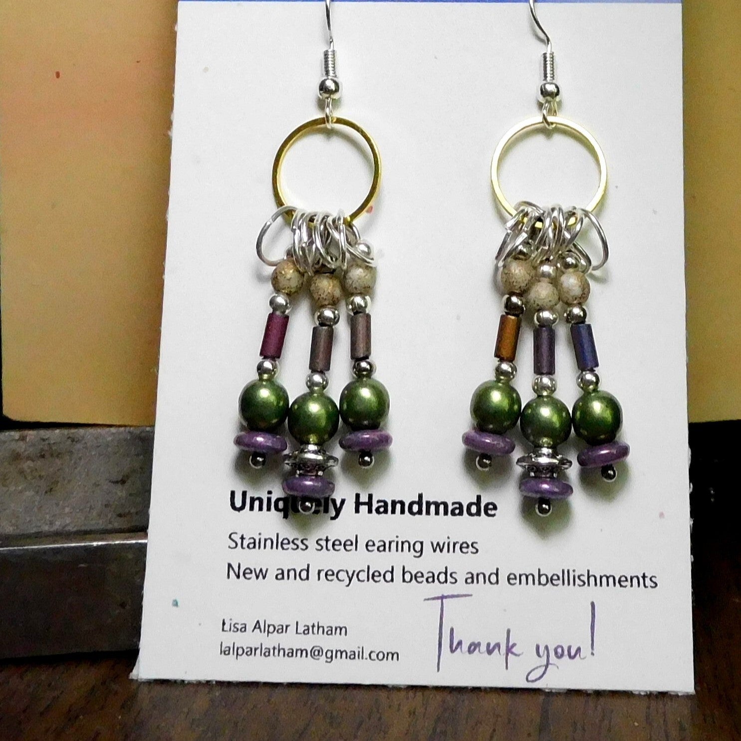 New and recycled beads, embellishments, findings, charms or whatever I could find. Stainless steel earring wires