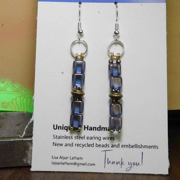New and recycled beads, embellishments, findings, charms or whatever I could find. Stainless steel earring wires