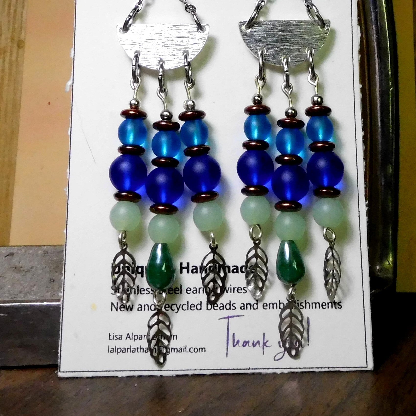 New and recycled beads, embellishments, findings, charms or whatever I could find. Stainless steel earring wires