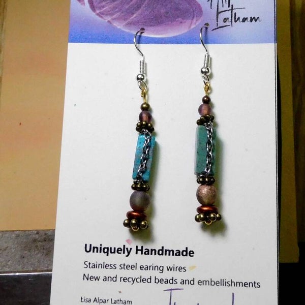 New and recycled beads, embellishments, findings, charms or whatever I could find. Stainless steel earring wires