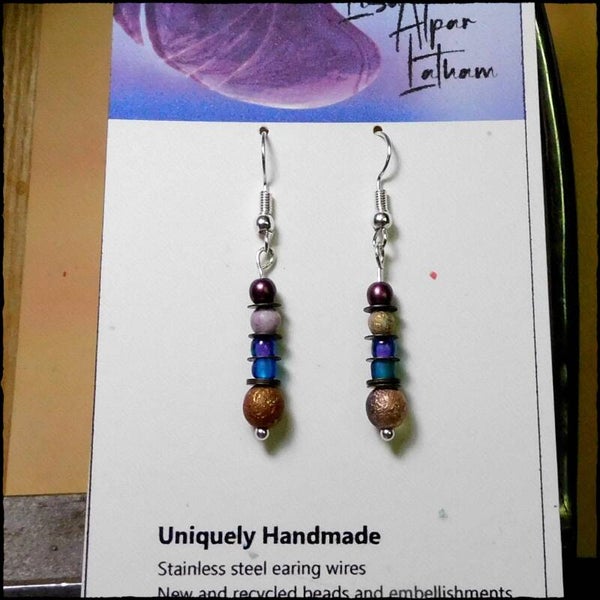 New and recycled beads, embellishments, findings, charms or whatever I could find. Stainless steel earring wires