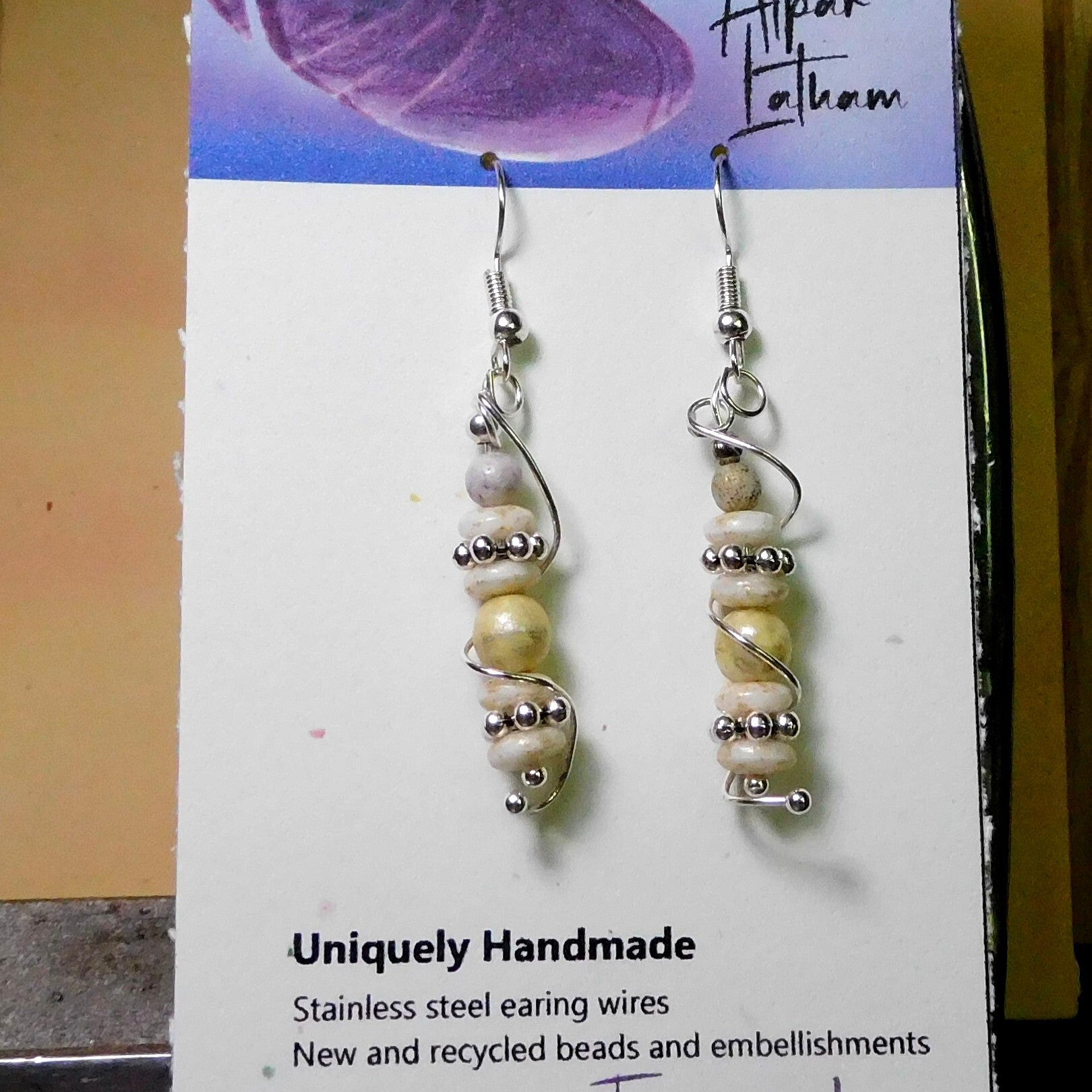 New and recycled beads, embellishments, findings, charms or whatever I could find. Stainless steel earring wires