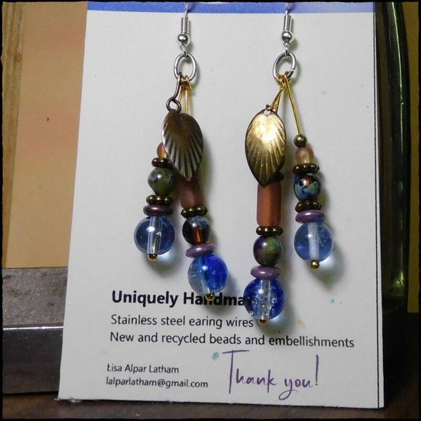 New and recycled beads, embellishments, findings, charms or whatever I could find. Stainless steel earring wires