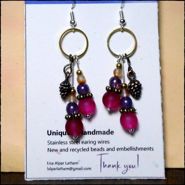 New and recycled beads, embellishments, findings, charms or whatever I could find. Stainless steel earring wires