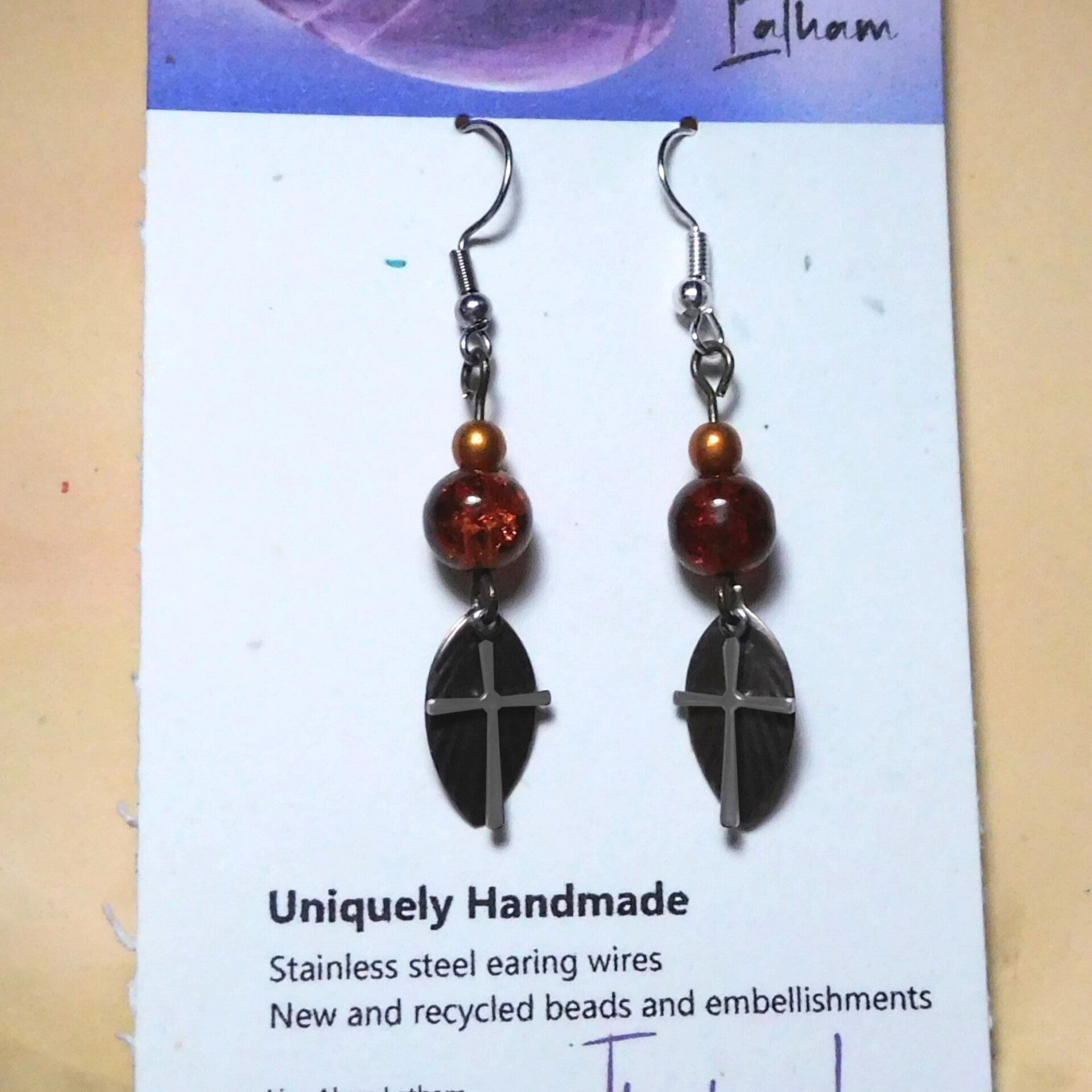 New and recycled beads, embellishments, findings, charms or whatever I could find. Stainless steel earring wires