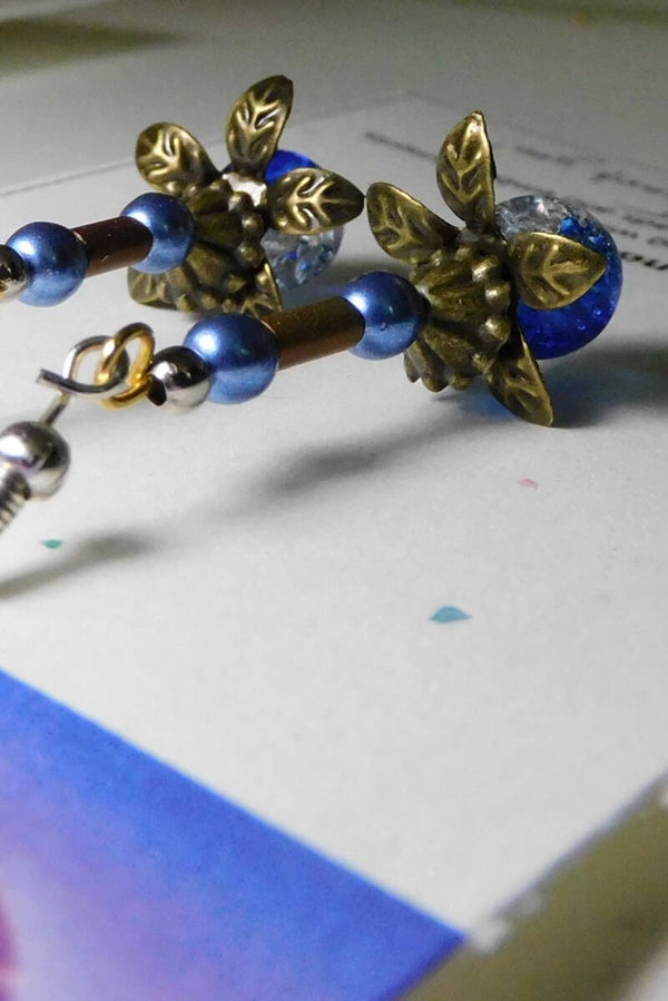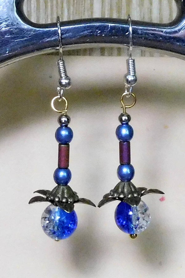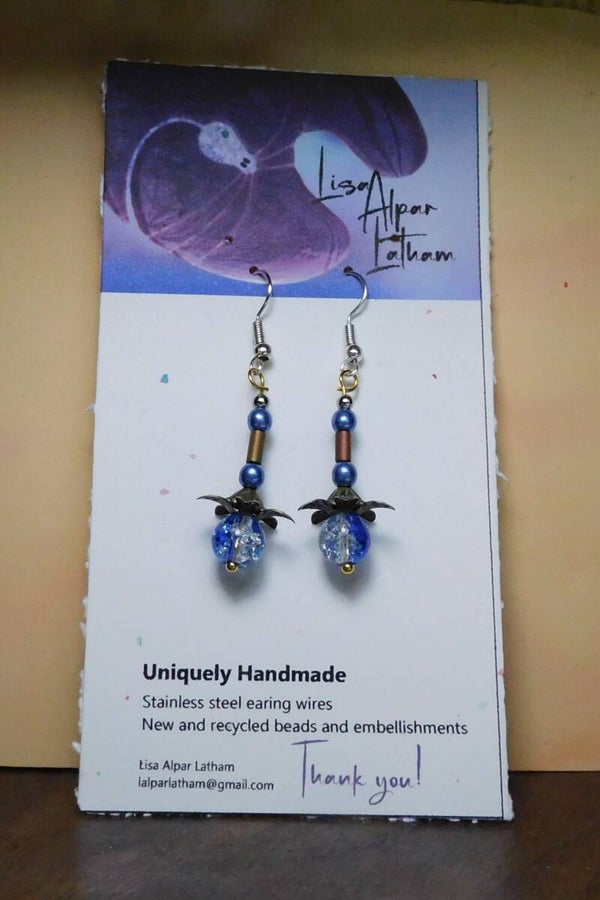 New and recycled beads, embellishments, findings, charms or whatever I could find. Stainless steel earring wires