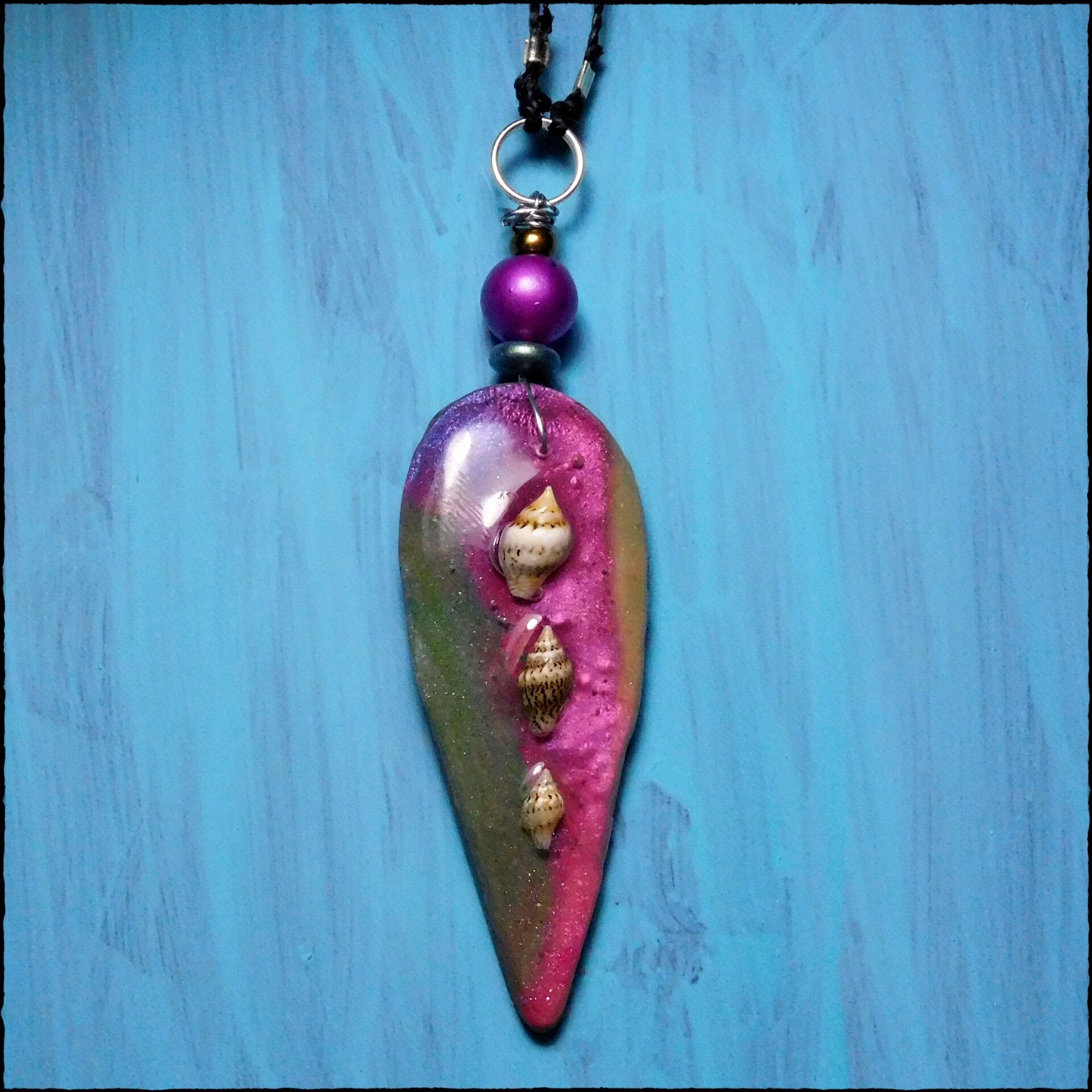 Unique, one-of-a-kind handmade polymer clay pendant embellished with tiny sea shells.