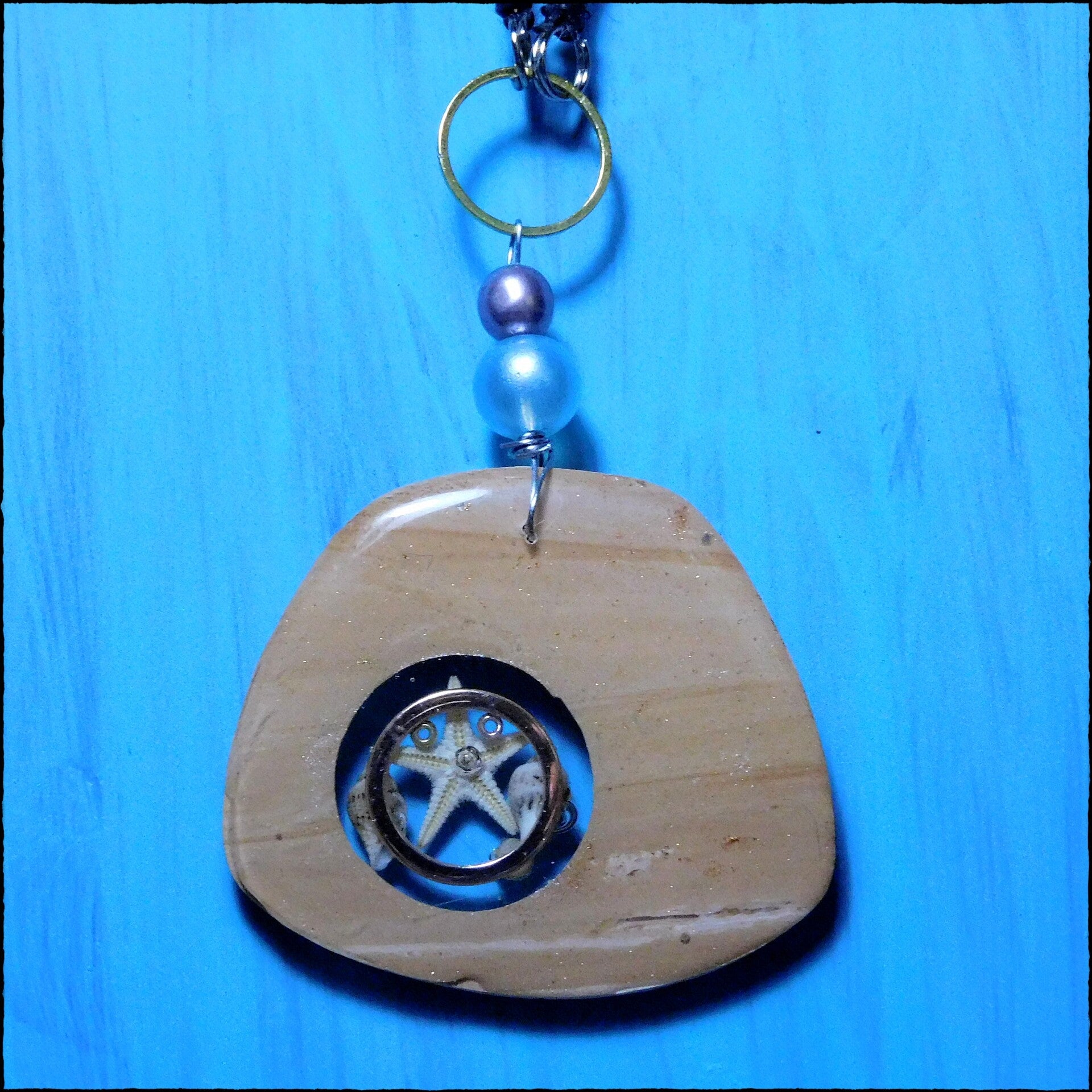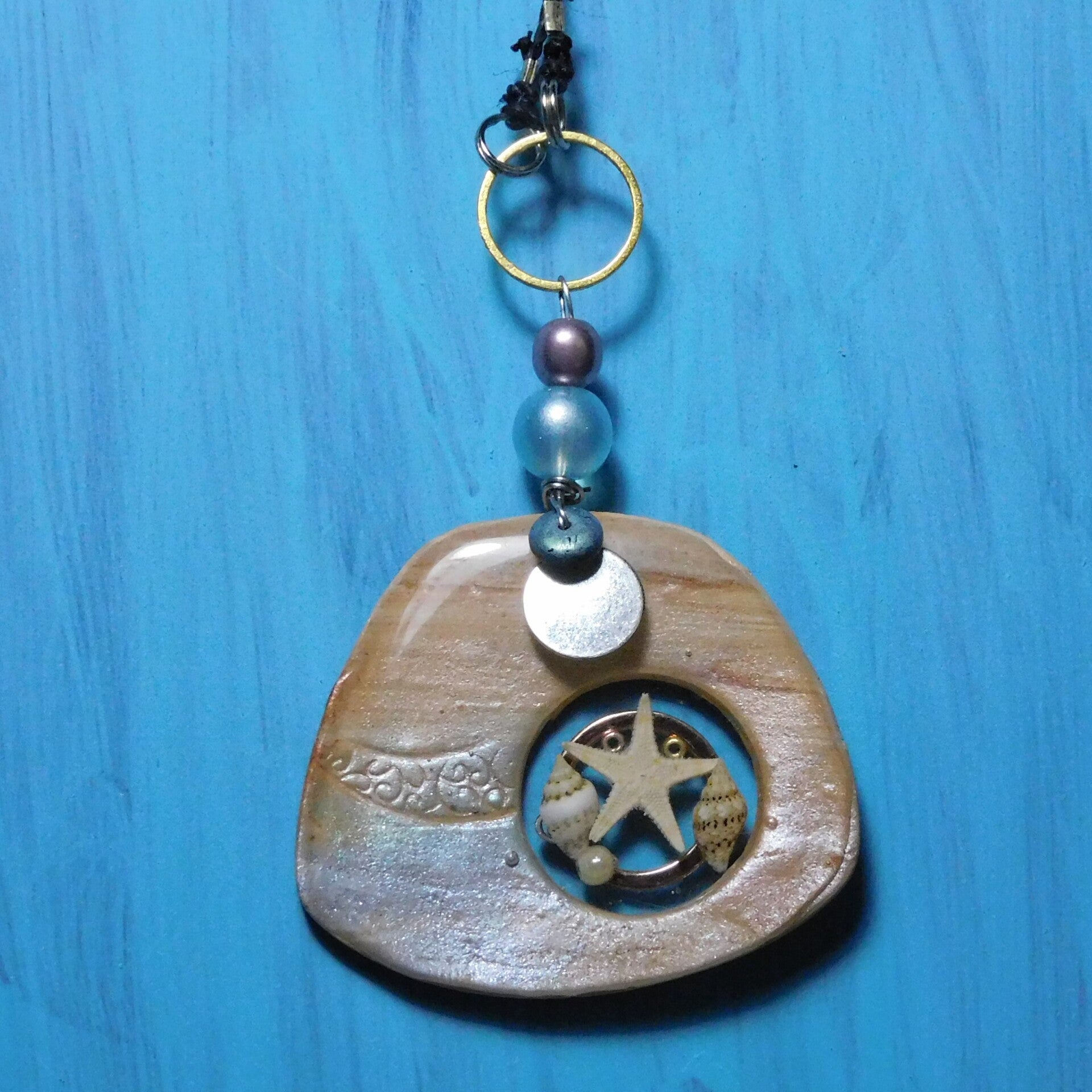 Unique, one-of-a-kind handmade polymer clay pendant with tiny sea shells embeded in a window of UV Resin.
