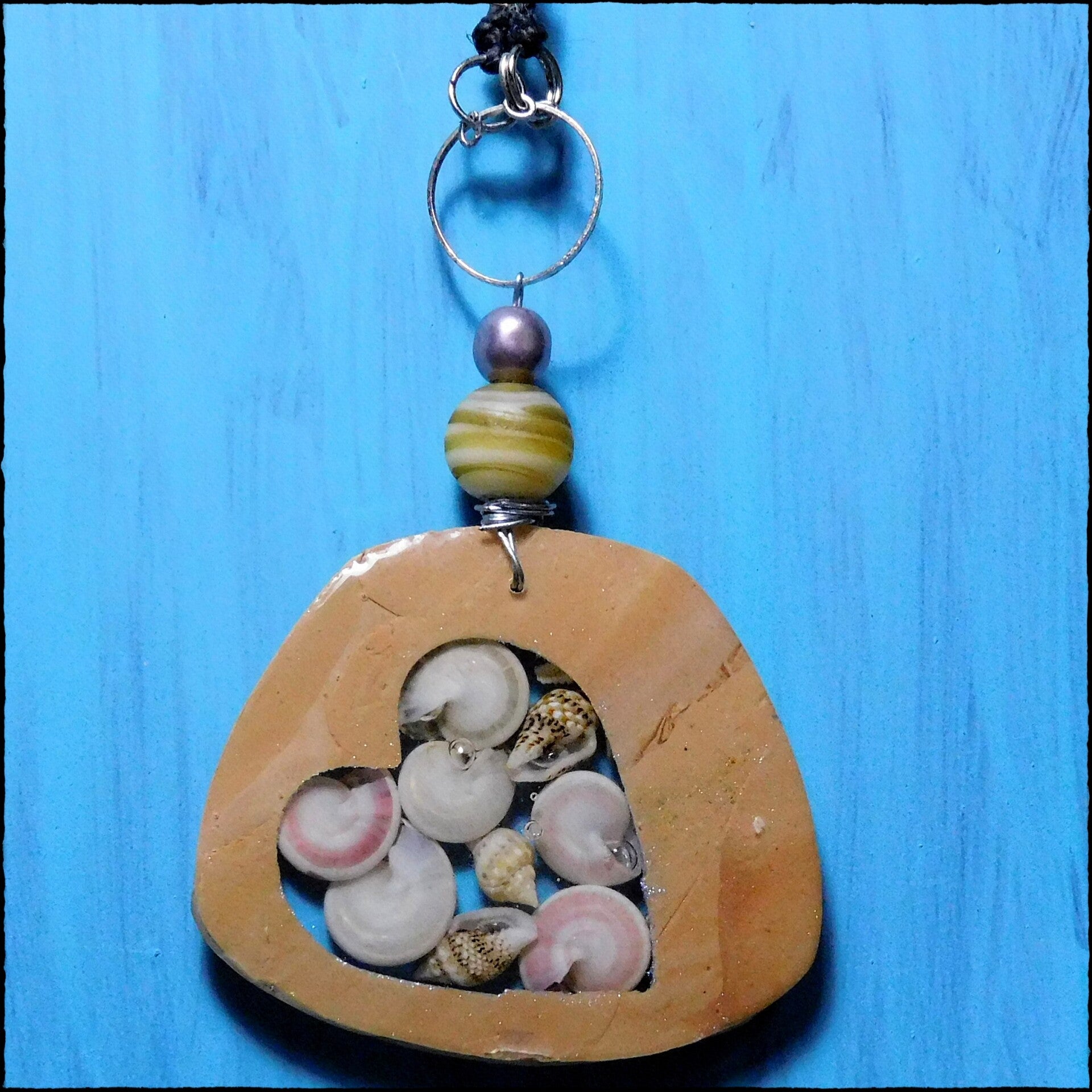 Unique, one-of-a-kind handmade polymer clay pendant with tiny sea shells embeded in a window of UV Resin.