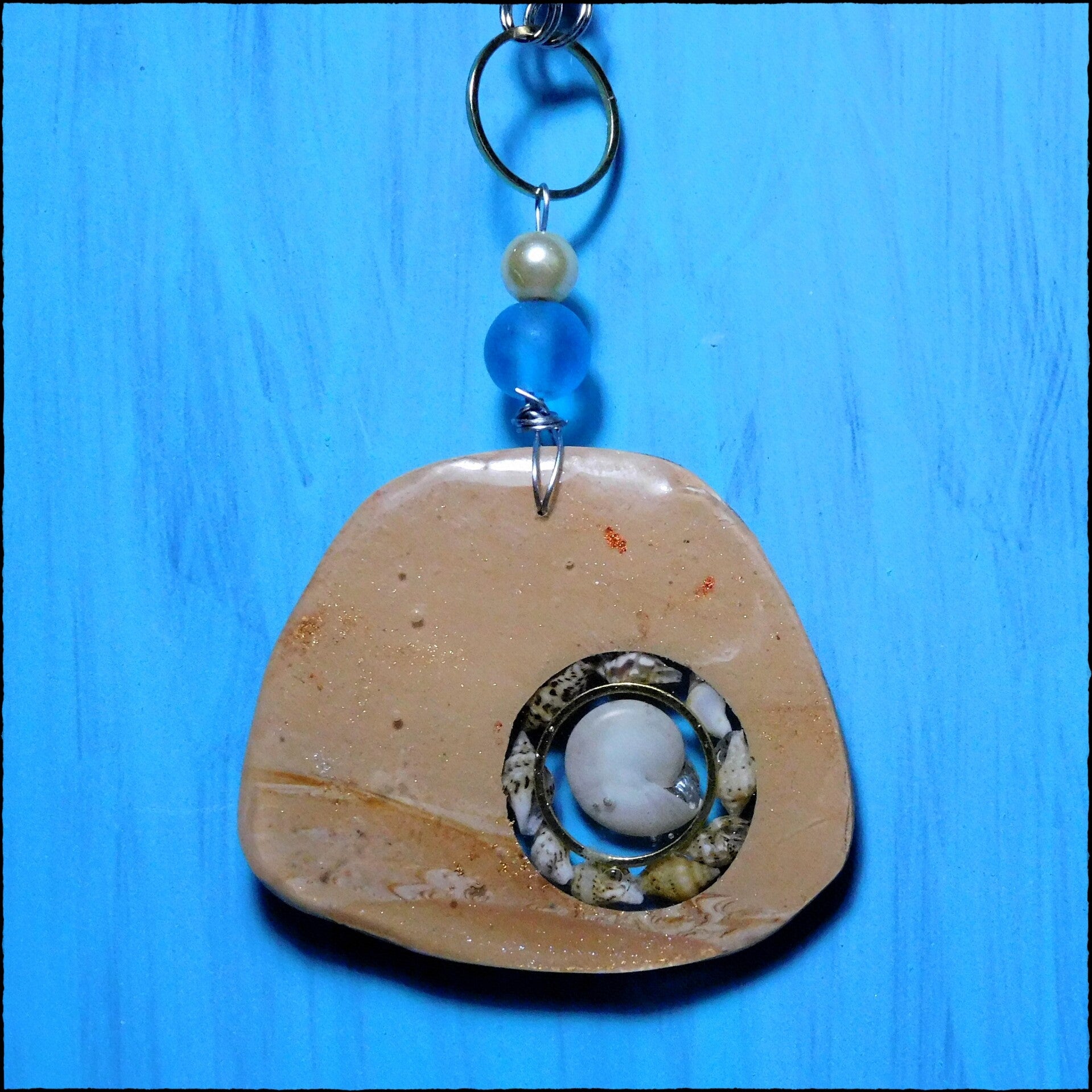 Unique, one-of-a-kind handmade polymer clay pendant with tiny sea shells embeded in a window of UV Resin.