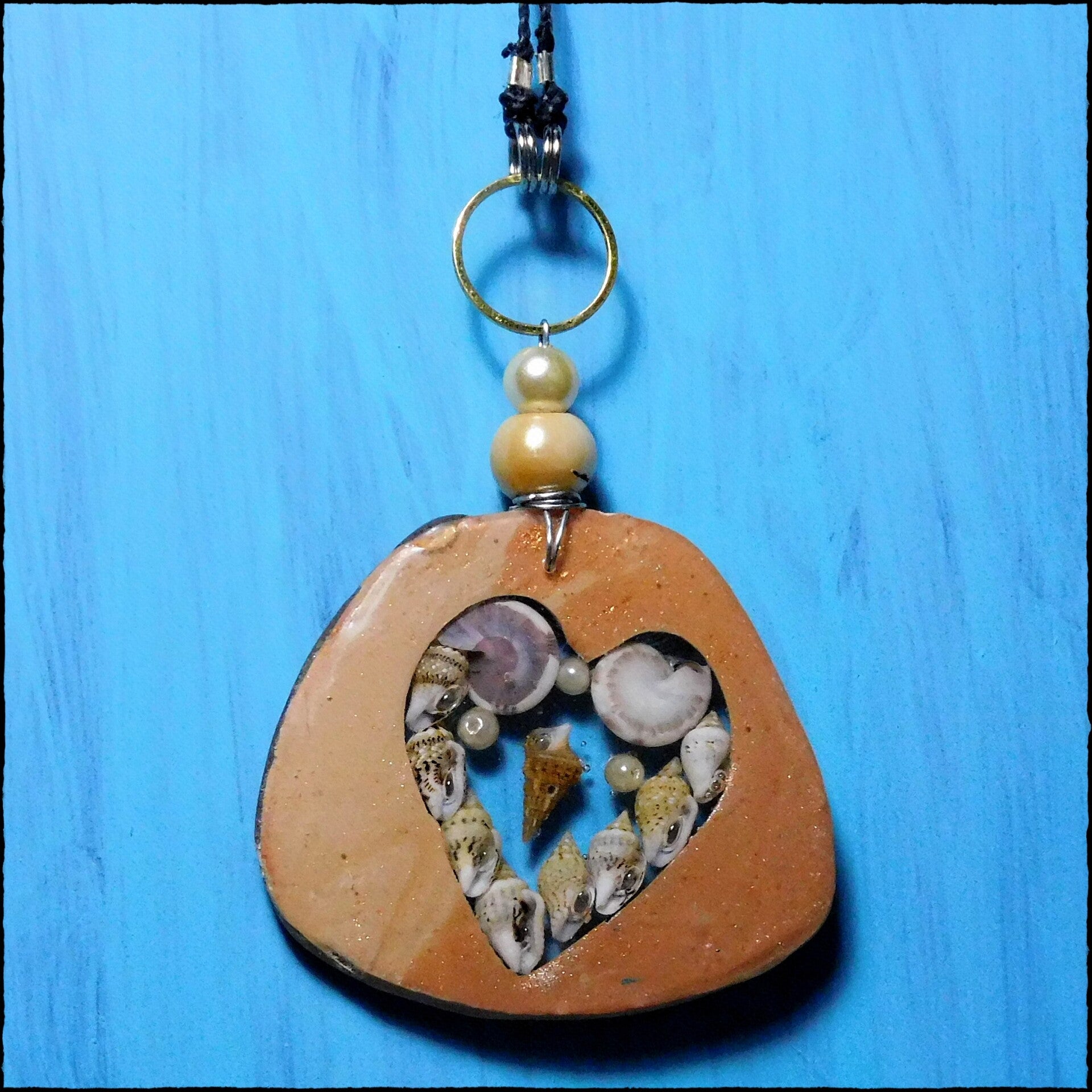 Unique, one-of-a-kind handmade polymer clay pendant with tiny sea shells embeded in a window of UV Resin.
